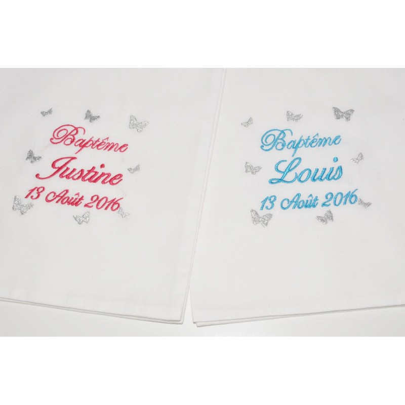 Jumeaux:2 Echarpes de baptême pour bébé/enfant en satin ou coton personnalisable.(à choisir lors de votre commande)avec papillons,date ,baptême et prénom brodés.