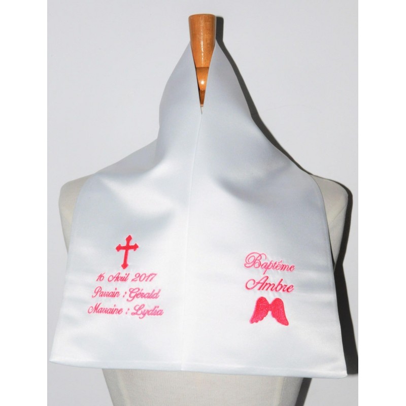 Echarpe de baptême aile d' ange pour bébé en satin ou coton personnalisable (à choisir lors de votre commande)avec aile d'ange,baptême et prénom brodés d'un cà´té et croix,date,parrain et marraine de l'autre. 50% COTON 50 synthétique Dimension: environ H87cm x L19cm Lavage en machine à 30°C Fait main Indiquez moi le prénom a broder ainsi que la date du baptême, tissu satin ou coton et coloris de la broderie. Coloris disponible: argenté, fuchsia, gris clair, bleu ciel, turquoise, rose(ici), taupe, vert, orange, violet, gris foncé etc.... Pour personnaliser,il faut d'abord mettre l'article au panier et me dire dans un message ou commentaire,le prénom, la date et le coloris de la broderie que vous désirez.Ou me contacter via la boutique et me poser votre question.Merci